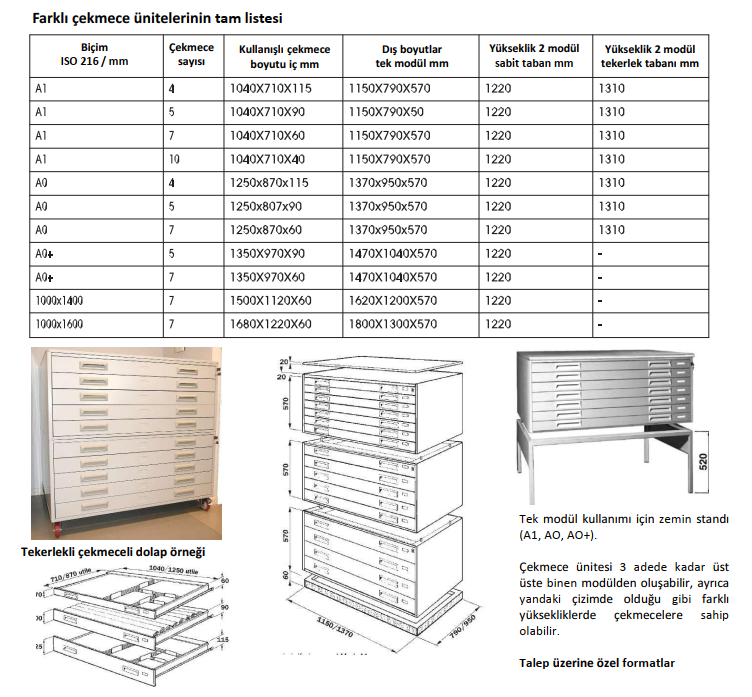 A1, A0, A0+, 100x140 120x160 sayfalar için farklı tiplerde önerilen çekmeceli dosya dolapları, cm olarak beş farklı yükseklikte çekmece sığabilmektedir. 4-5-7-10-12.5 (yalnızca bazı formatlar için) örneğin 2 modüllü bloklardan oluşan, 8 ila 20 çekmeceli farklı kombinasyonlar; Vidasız basit bir kilitleme sistemi ile üst üste eklenerek mükemmel modüler yapılar oluşturularak, aynı nihai yapıya yerleştirilmiş aynı veya farklı çekmecelerle, her türlü boyut gereksinimini karşılayacak şekilde, tamamı tabana dayanan sonsuz kompozisyonlar elde etmek mümkündür. Sağlam bir kaide ve üst kısmı çelik bir destek yüzeyinden veya tekerlekli bir taban (A1, AO) üzerinde kapatılmıştır. A1, A0 ve A0+ formatları için, yan yana çekmeceli ünitelerde aynı üst destek seviyesini elde etmek için çekmece modülleriyle aynı yükseklikte bir destek tabanına monte edilmiş tek bir modülün kullanılması da mümkündür. . Tüm çekmeceler, darbeye dayanıklı plastik kulplar ve kart tutucularla donatılmış, mevcut Avrupa mevzuatına uygun ön devrilme önleyici cihazla donatılmış ve her modül için monoblok bir kilitle kapatılmış, kısmen çıkarılabilir, ses geçirmez yatak kılavuzları (derinliğin 4/5'i) üzerinde kayar; Detaylara göre 8-20/10 kalınlıklarda birinci tercih FeP01 çelik sacdan yapılmış, kapak dahil tüm dış köşeleri yuvarlatılmış (R.8) ve hareketli iç çekmece bölücüleriyle donatılmıştır. UNI testleri: 8596/84-8604/84-8605/84-8606/84-9087/87-9604/90