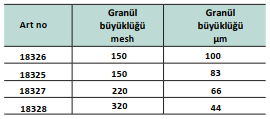 0,10-0,50 mm (100 ila 600 μmm) orta kum boyutuna sahip alüminyum silikat bazlı aşındırıcı. Sertlik 6/7 Mohs ölçeği. Serbest silika içermez. Konf. torba 50 Kg. - palet 1500 kg