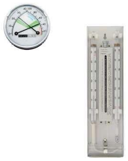 İki hassas termometre ve döner sıcaklık/%RH dönüşüm tablosuna sahip alüminyum bir yapıdan oluşur. Sıcaklık ölçeği 0/+60°C bölüm 0,5 °C.