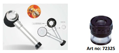 Büyük 3 diyoptri ø 90 mm lens ve halka tipi floresan mikrolamba aydınlatması ile donatılmış lamba. Güç kaynağı 4 x 1,5 V pil ve 230v/6v güç kaynağı ünitesi dahildir. Boyutlar: 295x135x25 mm. Ağırlık: 300 gr