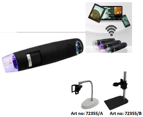Wi-Fi iletimli taşınabilir dijital mikroskoplar. Özel yazılım ve uygulamalar sayesinde görüntüler ve videolar yakalanabilir, ölçülebilir ve PC'lerde, akıllı telefonlarda ve tabletlerde saklanabilir. Çift kullanım: Wi-Fi ve USB kablosu. Kalibrasyon ve ölçüm fonksiyonlu profesyonel yazılım. -Çözünürlük 1.3MP / 1280x 1024.-İşletim sistemleri Windows, OS X, IOS, Android-WiFi protokolü IEEE 802.11b / g / n standartları -5 metreye kadar WiFi iletimi - Ölçüm fonksiyonu. -Sürekli büyütme 5~200X - Odaklama mesafesi 8~200mm - Micro Touch (çıtçıtlı düğme) - Bağlantı: Wi-fi ve USB 2.0 çıkışı. - Yazılım kontrollü AÇIK / KAPALI LED aydınlatma. - Şarj edilebilir dahili lityum pil: süre yaklaşık 2 saattam kullanımda - Ağırlık 88 gr Paket içeriği: Wi-Fi mikroskop; güç kaynağı; 1,2 m USB kablosu ve kurulum kılavuzu; değiştirilebilir kapak; kalibrasyon için milimetre ızgarası. Aksesuarlar ayrıca sipariş edilmelidir. Art no: 72355 / A Esnek kollu masa standı Art no: 72355 / B Mikrometrik tekerlek ile ince ayarlı profesyonel sütunlu ve dikey kollu masa desteği.