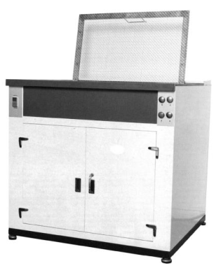 Makine epoksi tozlarla boyanmış çelik bir yapıdan oluşmakta olup, çalışma deposu kalın PVC'den, belge desteği ve koruma ağı tamamen paslanmaz çelikten imal edilmiştir. Alt kısımda 4 yan panel açılarak kolayca incelenebilen pompalar, depo ve elektrik panosu bulunmaktadır. Kullanışlı boyut: 525 x 400 mm Çalışma yüksekliği: 900 mm Boyutlar (GxDxY): 640 x 550 x 1050 mm Toplam ağırlık: 70 Kg Güç kaynağı: 230 Volt 50 Hz tek fazlı Toplam güç: 0,75 KW + 1,1 KW