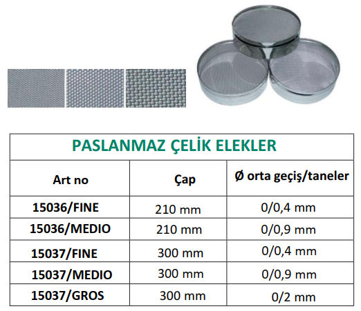 4 değiştirilebilir halkalı elek, paslanmaz çelik, 0,5/1/2/3 mm gözenekli, çap 21 cm.
