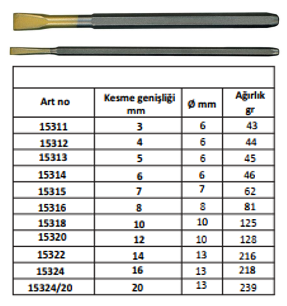 Sert lehim kaynağı için tungsten karbür (WIDIA) kaplama uygulanmış çelik keskiler, granit, duvar, mermer ve genel olarak taş malzemeler üzerinde heykel ve restorasyon çalışmaları için uygundur. Altıgen sap uzunluğu 200 mm, WIDIA plaka uzunluğu 10/18 mm ve 1/4 mm kalınlığında.