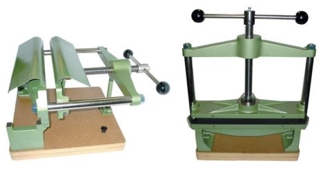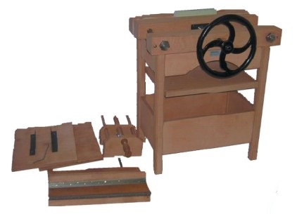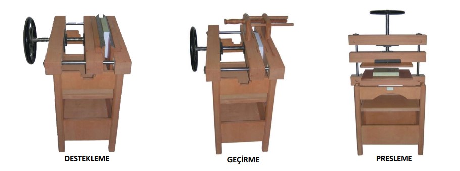 Ahşap ve çelikten ayaklı sırt baskılayıcı, pres, geçirme vb. olarak işlev görür. Mengene ara mesafe: 50 cm Yükseklik: 80 cm Ağırlık: 40 Kg Genel boyutlar: 40 x 62 x 78 h. cm Sırt yuvarlama tablaları, bıçaklı geçirme sistemi baskılama için bir çift levha.