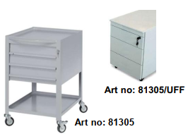 Gri epoksi tozlarla boyanmış sacdan yapılmıştır. Kilitli ve döner tekerlekli 3 çekmece ile donatılmıştır. Art no: 81305 Ölçü: 520 x 604 x 800 (h) mm Art no: 81305/UFF Ölçü: 420x580x550 (h) mm tezgahlar/raflar için h 75 cm.