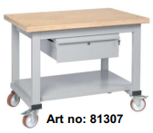 Tamamen gri epoksi tozlarla boyanmış sacdan yapılmıştır. Üst tabla 40 mm çok katmanlı kayın ağacından. Bilyalı yataklı sürgülü çekmece ve kilit ile donatılmıştır.Döner tekerlekler: Ø 125 mm.Boyutlar: 1000x750x825 (h) mm