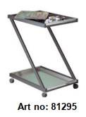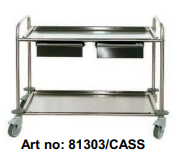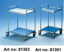 Tamamen epoksi toz boyalı sacdan imal edilmiştir. Gri renktedir. Art no: 81306 Boyut: 800 x 420 x 800 (h) mm Döner tekerlekler: Ø 80 mm Art no: 81306/BIG Boyut: 1000 x 600 x 825 (h)mm. Döner tekerlekler: Ø 125 mm
