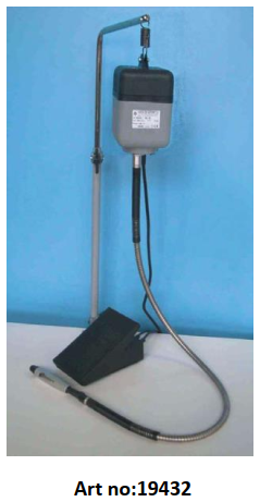 Işıklı güç düğmesi, gösterge ışıklı 'ters' fonksiyon düğmesi (ters dönüş yönü), hız değişim membran düğmeleri, RPM göstergesi (19288/450 hariç), ateşleme ayak pedalı bağlantısı, mikromotor el aleti bağlantısı, sigortalar ve güç kablosu ile donatılmış güç/regülasyon ünitesinden oluşan masa üstü modeller. Üniteler, mikromotor dönerken 'geri vitesi' devre dışı bırakan bir güvenlik cihazı ile donatılmıştır. Hız değişimi, sabit torku korurken besleme voltajını veya frekansını değiştiren elektronik bir cihaz aracılığıyla yapılır. Hız kontrollü kontrol ünitesi ve ters dönüş düğmesi ve hız göstergesi;- Kauçuk tabanlı mikromotor- Cımbız 2,35 mm (3 mm opsiyonel Art no: 19289/P)-Ayak pedalı