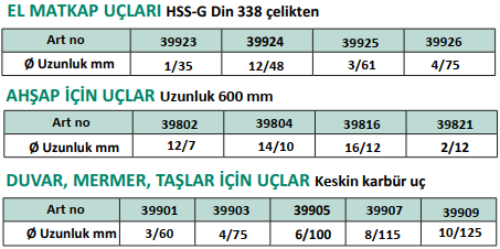 Uzunluk 600 mm. Tungsten karbür kesici kenarlı - Din 8039 Euro normu