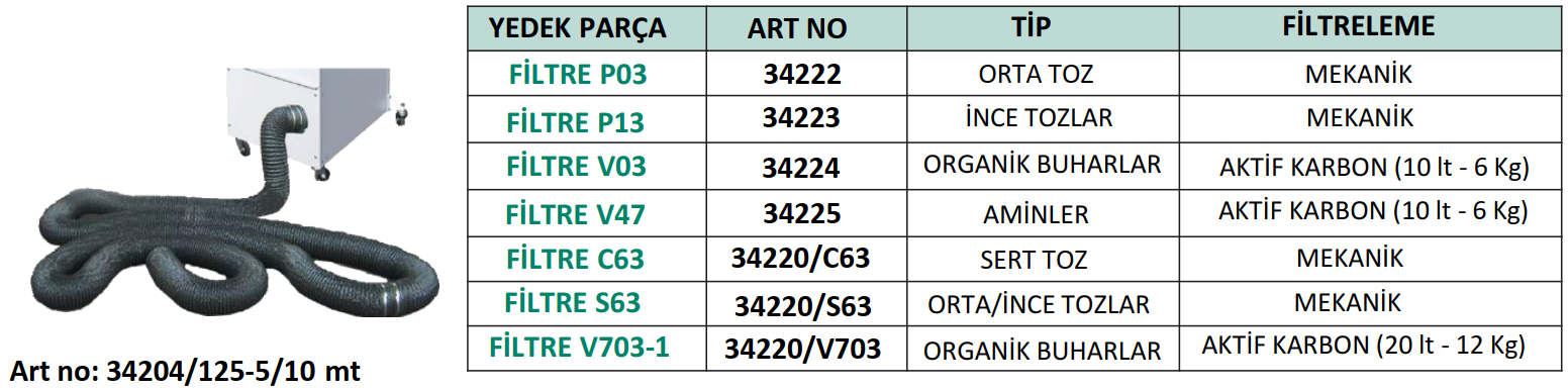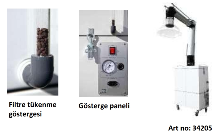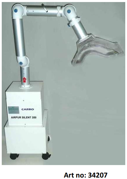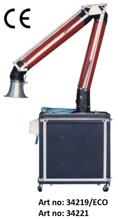 Özellikle organik bileşiklerin buharları ve az miktarda toksik olmayan toz ve diğer elementlerle kirlenmiş havanın ortamdaki devridaimi ile ekstraksiyonu, filtrelenmesi ve arıtılması için tasarlanmış düşük gürültü emisyonu < 63 (dB (A) olan tekerlekli bir kendi kendini temizleyicidir. Filtreleme sistemi: Arıtılacak hava, uygun büyüklükte bir havalandırma ünitesi ile kendinden temizleyicinin içine taşınır ve seçici ve aşamalı bir filtreleme sistemi ile mükemmel arıtma elde edilir. Toz (toksik olmayan) ve partiküllerin ortadan kaldırılması, iki filtreleme seviyesine sahip pileli kumaş filtrelerle sağlanır. Organik buharların ortadan kaldırılması, absorpsiyon prensibine dayalı olarak aktif karbon vasıtasıyla gerçekleştirilir. 2 m ø 100 mm pantograf, harmonik çelikten yay dengelemeli ve yüklü polimerden 18 sürtünme noktalı dörtlü kol. Epoksi boyalı çelikten rijit boru tesisatı ve yanmaz reçine kaplı kumaştan esnek bağlantılar. Makine gövdesi bağlantı tabanı kendinden yağlamalı conta üzerinde 360° döndürülebilir. Taşıma kulplu boyalı metal başlık. Makine bir solvent filtresi tükenme renk göstergesi ile donatılabilir. Özellikler: ISO 9001 kriterlerine uygun CE sertifikalı cihaz