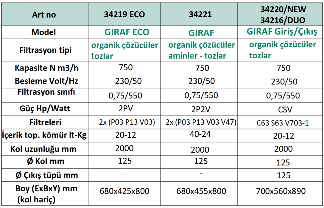 Nominal akış hızı: 500 Nm3/h Motor: 0,55 kW - 230 V Filtre sınıfı: No. 3 filtreleme seviyeleri Filtreler: Toz verimliliği için S68 G3Toz verimliliği için S59 F8V903 çözücüler (13 litre aktif karbon)Kol uzatma: 2000 mm Kol borusu çapı: 100 mm Kolsuz boyutlar: 685 x 388 x 769 mm Ağırlık: 55 Kg.