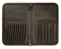 Kısa saplı fırçalar için 16 bölmeli ve 2 büyük cepli sert siyah naylon fermuarlı çanta.Kapalı şekilde ölçüler: 17x28 cm (3 cm arka).Açık şekilde ölçüler: 37x28 cm. Art no: 61648