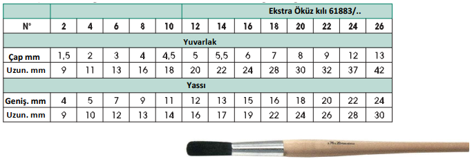 Kolinsky Zerdeva'sı kılından yuvarlak uçlu fırçalar. Çeper sacı nikel kaplıdır. Lake boyalı tahta tutma sapı.
