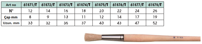 Art no: 61760 /.. Saf siyah kıllı yuvarlak uçlu fırçalar. Alüminyum yüksük. Ahşap saplı.