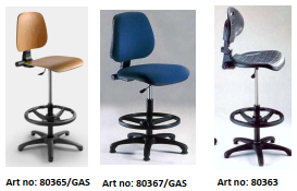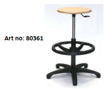 Mafsallı destekli, yatay ve yüksekliği ayarlanabilir sırtlık. Doğal vernikli 10mm kayın ağacından dikdörtgen şekilli, gaz kolu ile yüksekliği ayarlanabilen oturma yeri. Destek pedli 5 kollu siyah ABS taban. Gazlı kaldırma, ayarlanabilir yükseklik cm. 54/80. Krom kaplama çelik ayak dayama halkası. Art no: 80367/Gas - Art no: 80635/GAS gibi, yanmaz kumaştan koltuk (standart renk siyah, istek üzerine renk mavi/kırmızı/gri). Art no: 80363 - Stüdyo için sırtlıklı döner tabure, poliüretan oturma yeri, gazlı kaldırma.