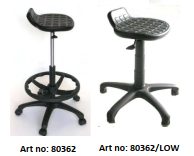 Siyah soğuk köpüklü poliüretan kaplı anatomik şekillendirmeli koltuk. Destek pedli siyah ABS'den 5 kollu taban. Gazlı kaldırma, ayarlanabilir yükseklik cm. 42/55. Boyut 50x50x81 cm. Ağırlık 14 Kg. Art no:80362 kaymaz ayak dayama halkası ile. Gazlı kaldırma, ayarlanabilir yükseklik cm. 55/80.