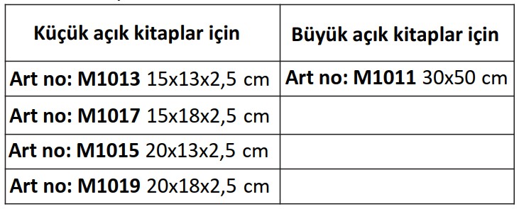 Özel tasarımı, çok çeşitli format ve kalınlıktaki kitapların araştırmacılar tarafından konsültasyon sırasında uygun şekilde desteklenmesini sağlar. Yıkanabilir %100 pamuk kılıf, nötr gri renk. Art no: M1041 STANDART MODEL maksimum 30x40 cm kapalı hacimler için Art no: M1043 BÜYÜK MODEL Büyük ciltler ve gazeteler için